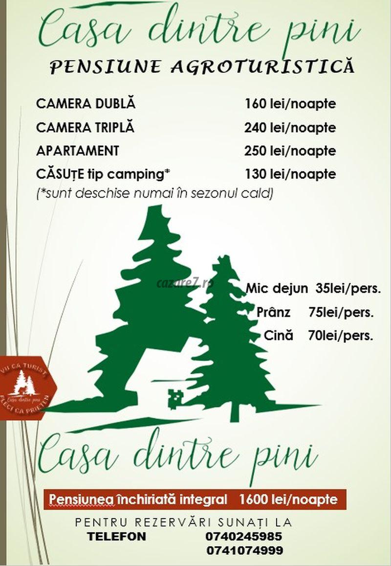 Străjuită de cursul sinuos al pârâului Agapia, într-o zonă pitorească de la marginea Parcului Natural Vânători Neamț, uitată de griji, stres și zgomot, Pensiunea Casa dintre Pini vă pune la dispoziție 9 spații de cazare dintre care 3 camere duble matrimoniale, o cameră triplă, un apartament cu 2 camere – toate dispunând de baie proprie și 4 căsuțe din lemn care beneficiază de 2 băi.