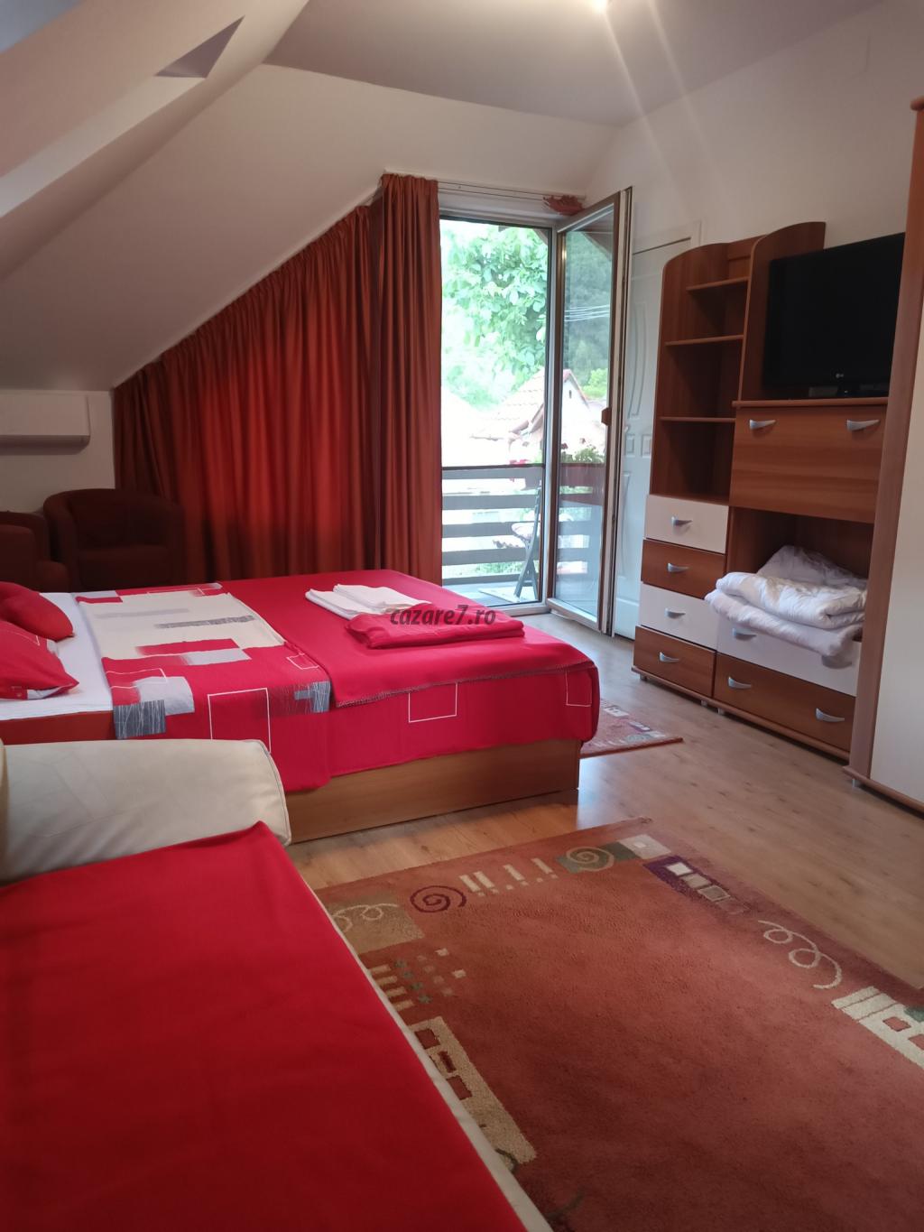 In camera dubla se pot caza 2 adulti ; dar avem o camera unde se pot caza 2 adulti (pat matrimonial) si 1 copil (fotoliu extensibil); mai avem o camere unde se pot caza 2 adulti (pat matrimonial) si 2 copii (canapea extensibila); Copiii sunt cazati contra cost.